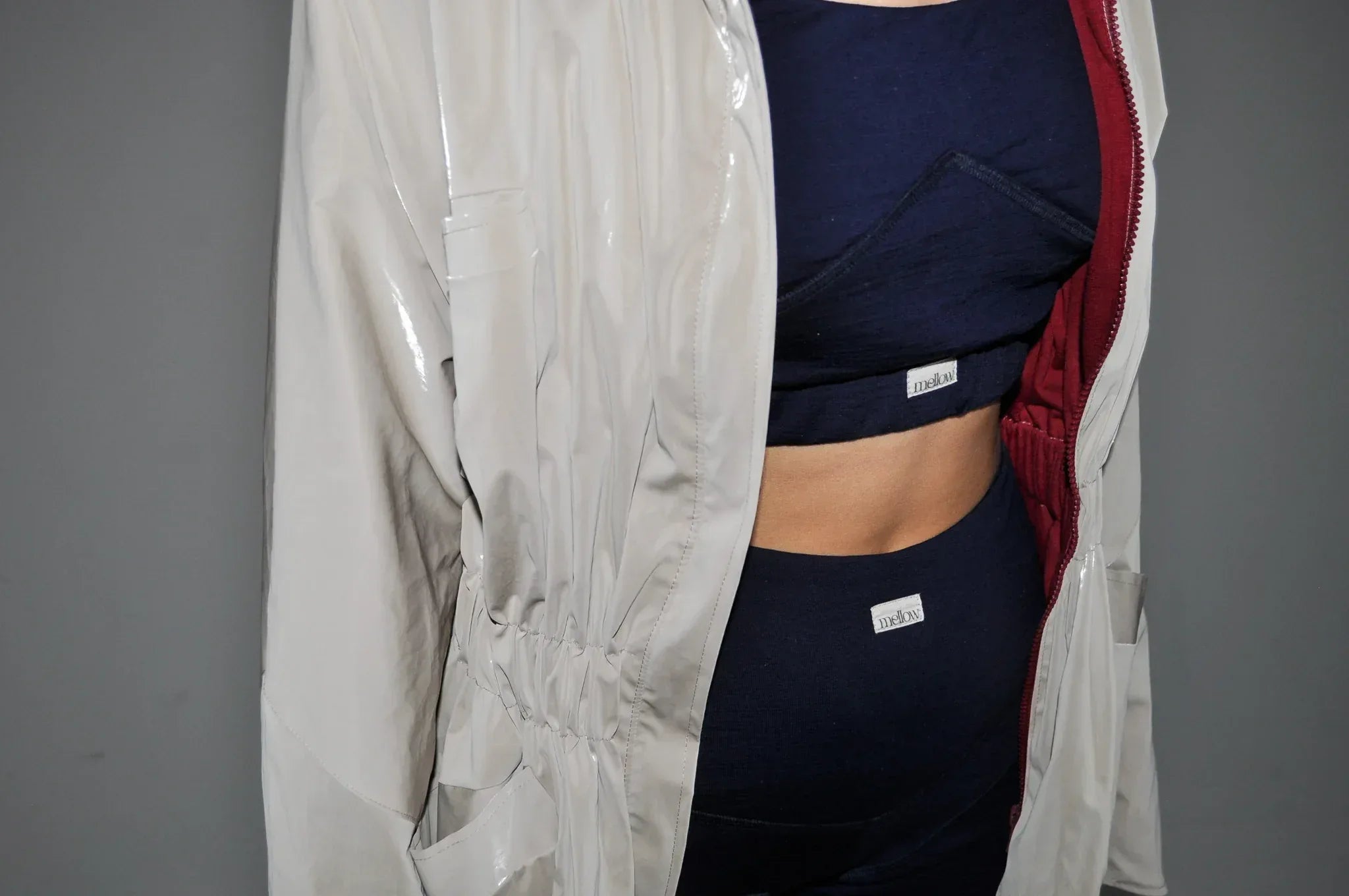 Crafted from 100% cotton and lined in a soft blend of lyocell and wool, this windbreaker redefines outerwear through a low-tox lens. Designed to pair effortlessly with our burgundy gym set, it balances clean performance with sculptural elegance — made for women who move with purpose.